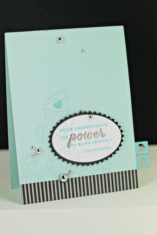 I utilized a simple spotlighting techique with that lovely stack of coffee mugs. I stamped it on the background and then on my white sentiment mat, cut with Limitless Layers Ovals. Easy and cute.