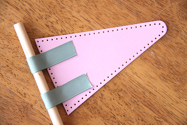 Hidden within the two layers is a paper core (also cut with the straight edge cover from the Scissor Keeper Dies), which gives the stiffness and "body" to my flag. I attached the ribbon with adhesive to the paper flag. The adhesive goes the entire length of the ribbon and holds the ribbon to the dowel.